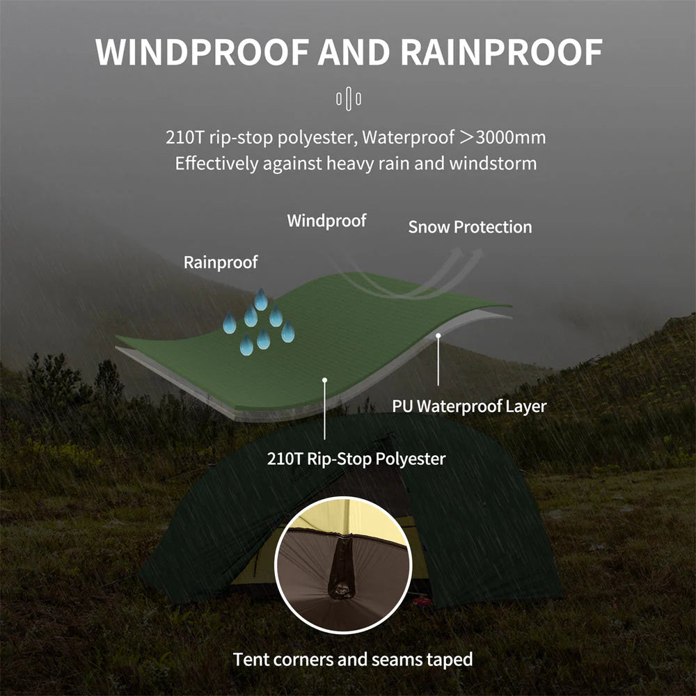 Silver Coating for Sun Protection and Rain Resistance: The inner layer of the outer tent is silver-coated, enhancing sun protection with a UPF rating of 50 and effectively blocking the harmful effects of UV rays. The 210T fabric also provides a waterproof rating of 3000mm, ensuring a dry interior during rainy conditions.