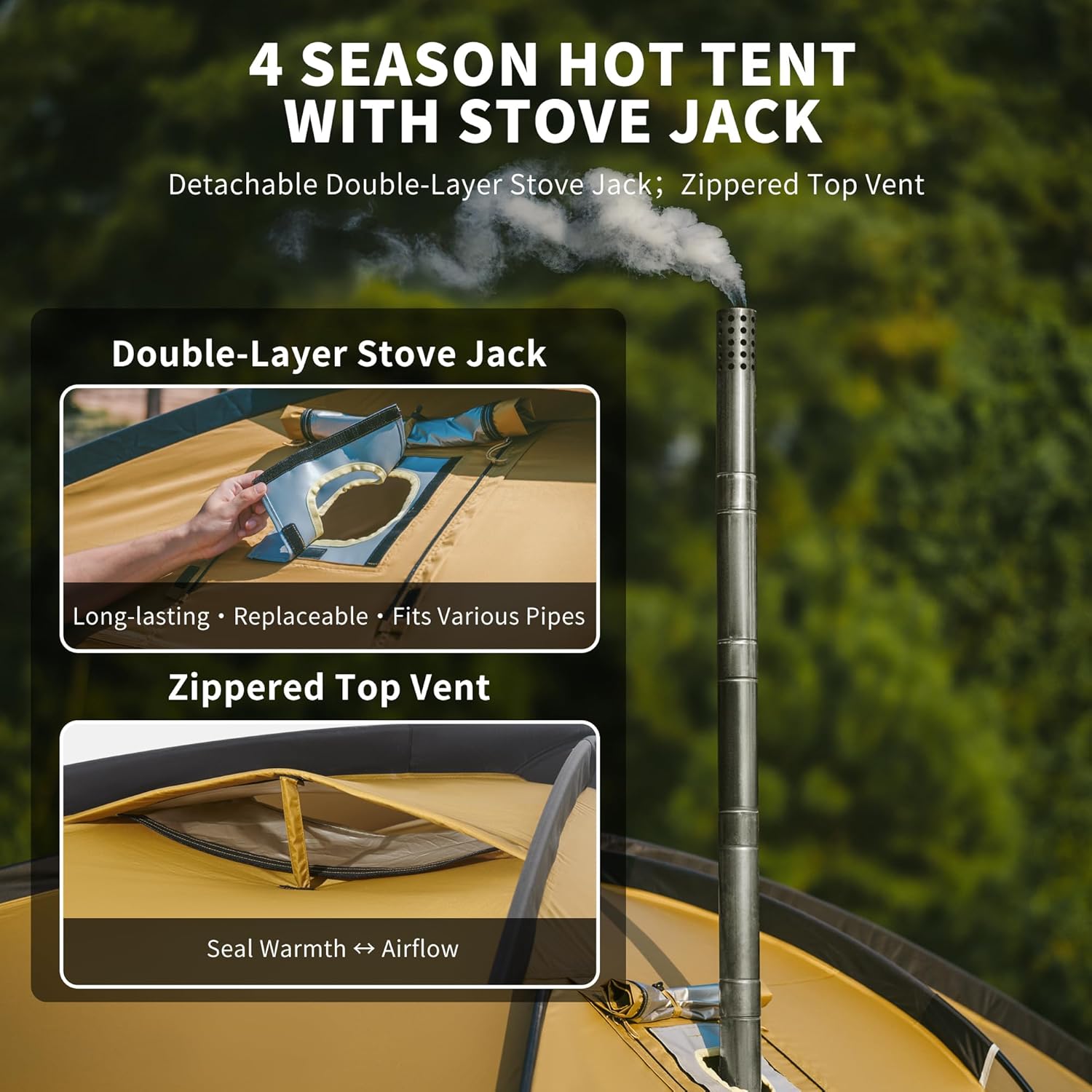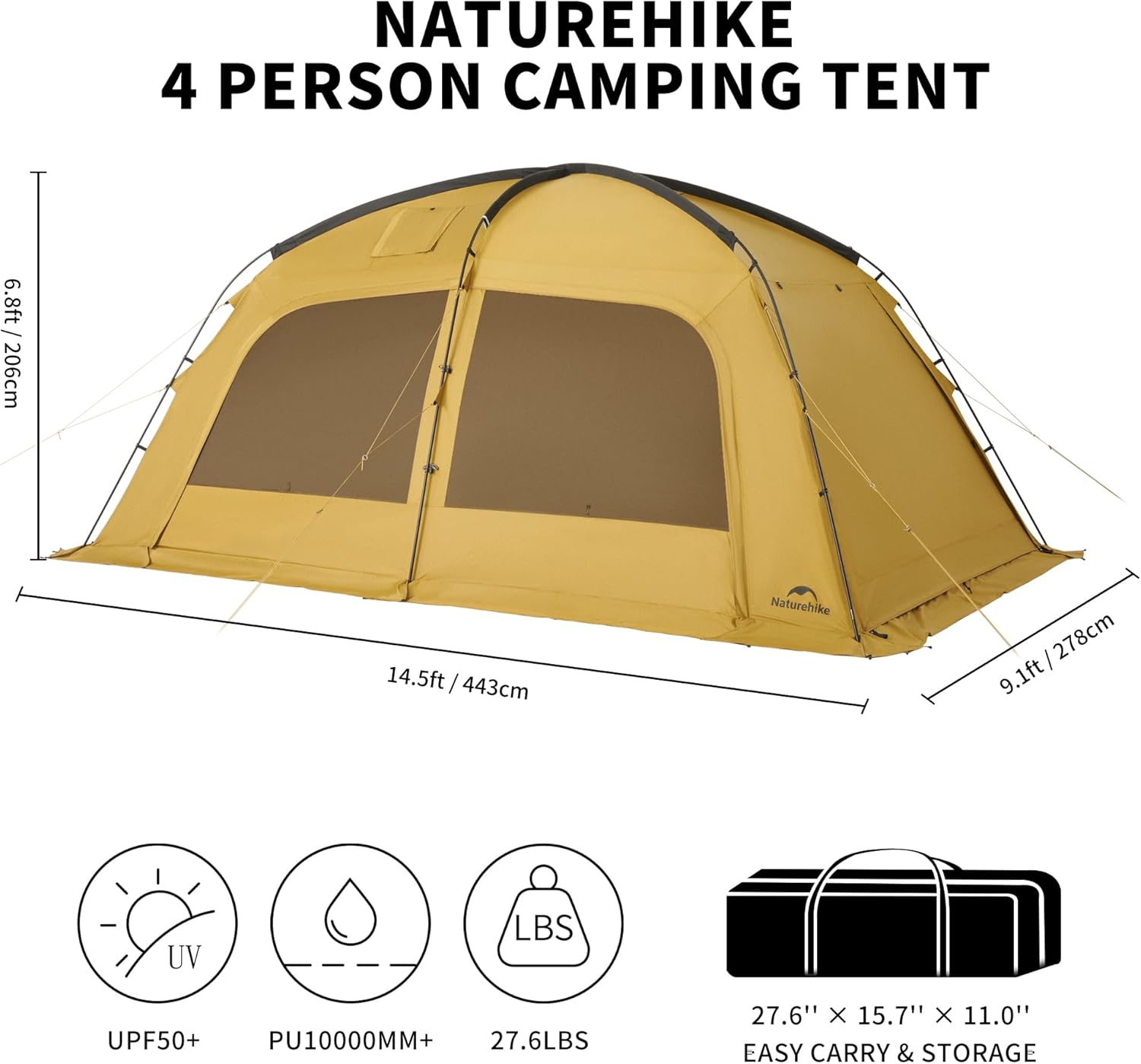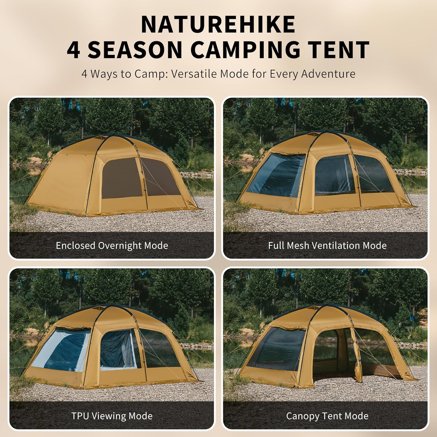 I have used this tent on several adventures this winter. It's very impressive. The build quality is top notch and what you would expect from NatureHike. The shelter is waterproof and held up to strong winds and snow load. The design is very functional with four doors. The mesh and zippers are high quality. The inner tent has a waterproof tub floor, keeping the sleeping area nice and dry. The tent has great ventilation, with two openings at the top of the tent. The area in front of the inner tent is great for a small table and two chairs and creates a nice sitting area. I highly recommend this four seasons tent. It's high quality and should last a lifetime of outdoor adventures.